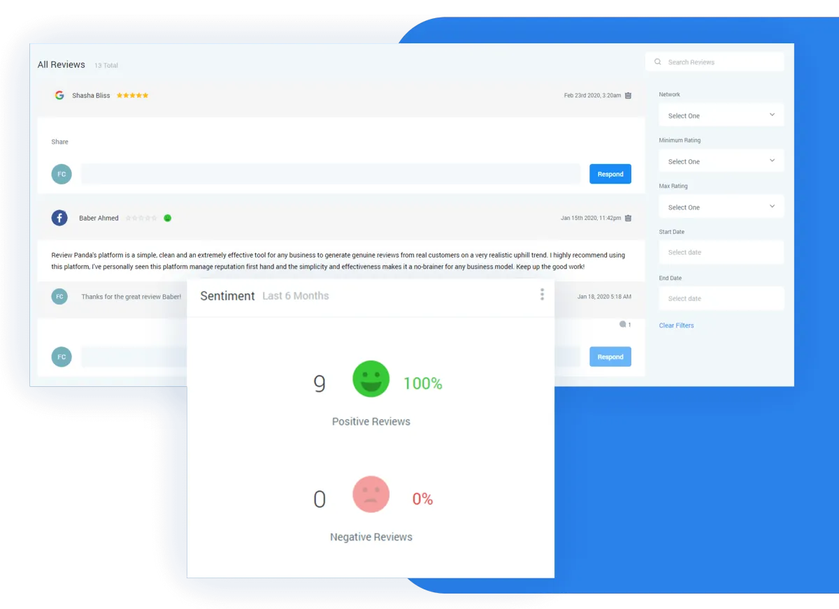 Envía solicitudes de reseña por SMS y correo electrónico con solo presionar un botón. Monitorea y responde a nuevas reseñas directamente desde el panel de control.