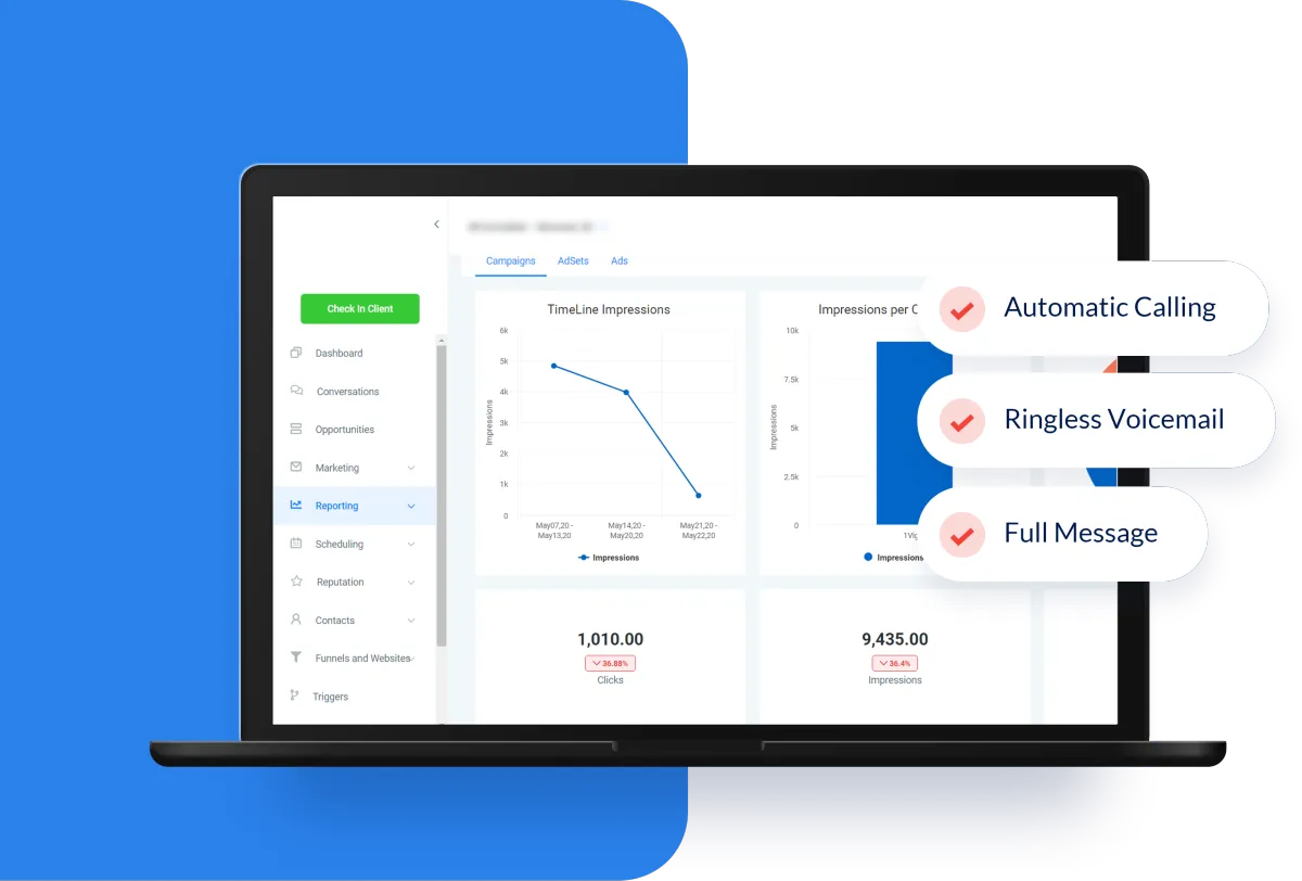 Construye formularios y embudos para capturar clientes potenciales, utiliza mensajes de texto automatizados, correos electrónicos, llamadas telefónicas, mensajes de voz y mensajes de Facebook ,(¡todo en un solo flujo!)... ¡y mucho más!
