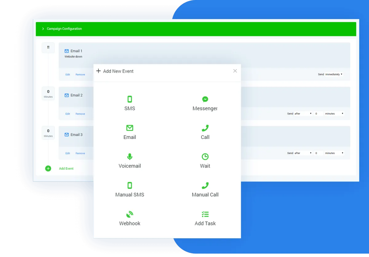 Construye campañas personalizadas que envían mensajes de texto, correos electrónicos, mensajes de voz e incluso mensajes de Facebook para convertir prospectos automáticamente..